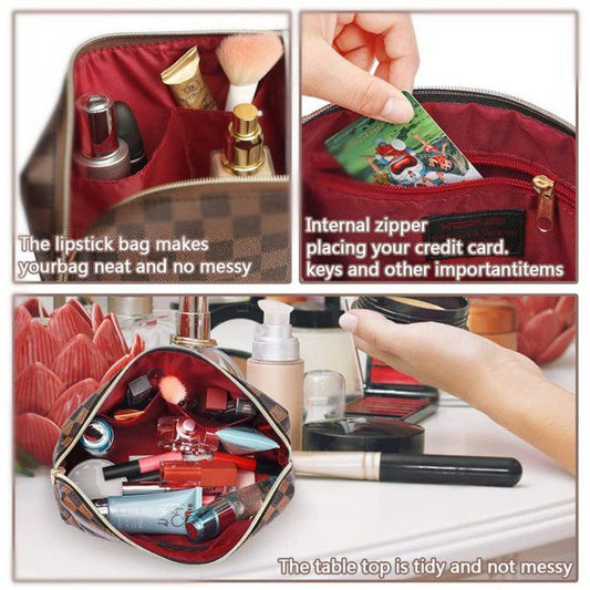 Checkered Makeup Bag; BAGMIND 2Pcs Travel Cosmetic Bags; Portable Toiletry Organizer for Women; Lightweight and Waterproof Leather Toiletries Bag for Girl Friend Wife Christmas Gifts; Brown