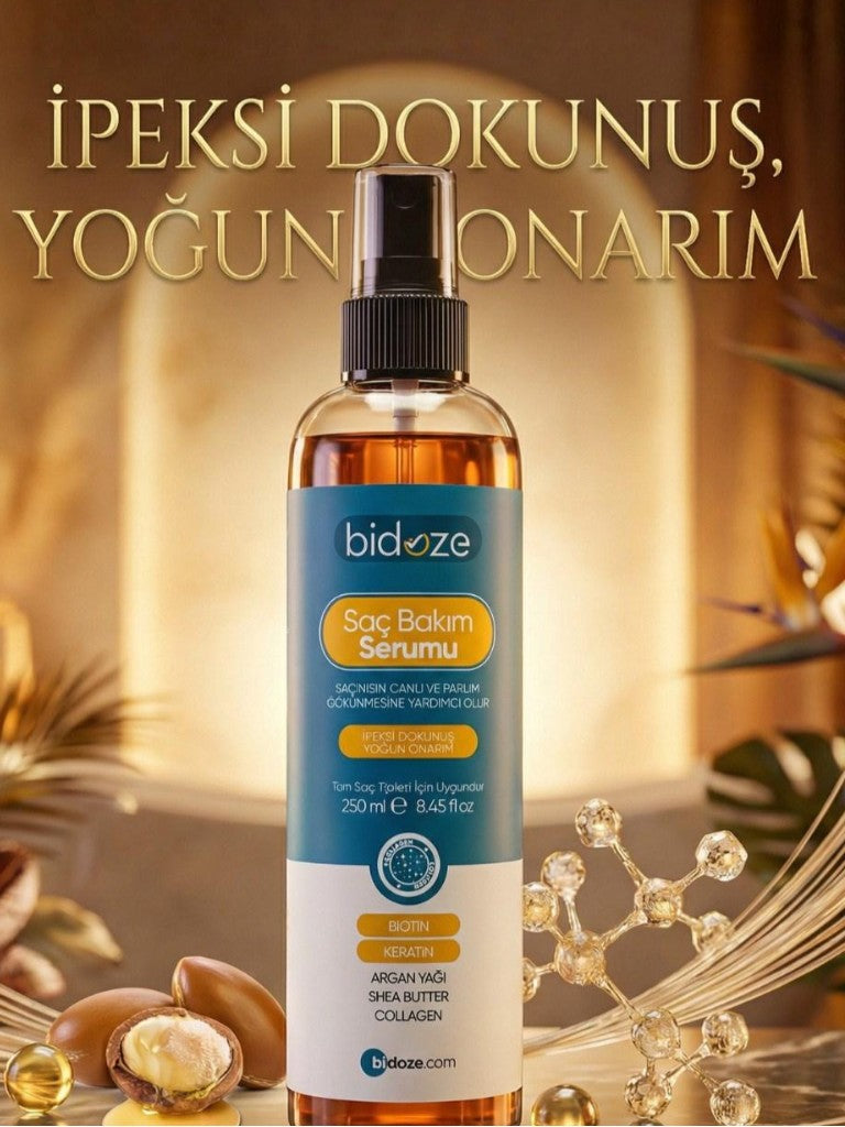 Bidoze Besleyici Onarıcı Yoğun Saç Bakım Serumu 250 ML | Argan Keratin Biotin Kolajen Zengin İçerikli | Kabarma Önleyici & Isı Koruyucu